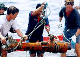He said the ship was believed to be owned by a Western maritime power although the cargo was from China. “The keris could have belonged to a Malay who was hired by the ship owner to help navigate the South China Sea or a gift from a Malay dignitary from the region,” he said. Department director-general Datuk Dr Adi Taha believed the ship belonged to the Portuguese and was heading from China to either Johor, Malacca or Batavia (present-day Jakarta). He said this was based on the discovery of two broken pieces of a square porcelain bottle with the Portuguese coat-of-arms painted in cobalt blue. He said the information was provided by Sten Sjostrand, the principal researcher of Nanhai Marine Archaeology Sdn Bhd, which is excavating the shipwreck with co-operation from the department. Dr Adi said the porcelain was manufactured during the later part of the Ming dynasty. He said some of the porcelain pieces were made at the imperial kilns at Jingdezhen while other plates and bowls were made at Zhangzhou. Some of the bowls showed the reign mark of Emperor Chenghua (1465-1487), and some others showed the reign mark of Emperor Chia-ching (1522-1566).