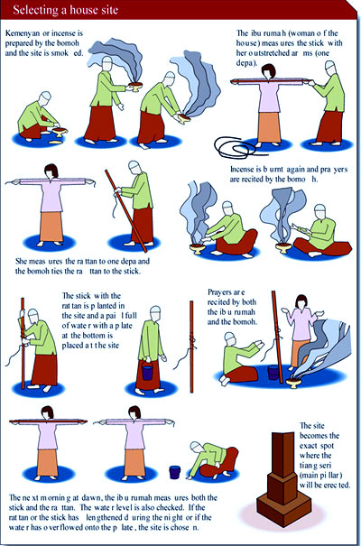 Dragon (tzaga) Dairy cow (sapi) Lion (singa) Dog (anjing) Draught cow (lembu) Donkey (keldai) Elephant (gajah) Crow (gagak) Each animal has certain characteristics; for instance the lion brings yearly prosperity, while the crow is an omen of the owner’s imminent death. Dr Amir also cites a site selection ritual, from Lim Jee Yuan’s book, The Malay House, involving a depa-length of rattan and a pail of water (see graphic) that is strikingly similar to what Terengganu’s Awie prescribes. What about directions? Skeat’s book says the Malays believe a site sloping from a higher south side towards the north would bring “absolute peacefulness”. North, south, gold, silver, third generation – these are words that would surely ring a bell in Chinese feng shui! Another custom to determine the suitability of a particular site involves a mother’s dreams. According to Skeat, the procedure is to clear the undergrowth in the area, lay four sticks in the centre and take a clod of earth in the hand. Then chant to the local spirits as follows: Ho, children of Menteri Guru; Who dwell in the Four Corners of the World; I crave this plot as a boon; If it is good, show me a good omen; If it is bad, show me a bad omen. Next, wrap the clod of earth in white cloth, fumigate it with incense, and place it under your pillow at night. If the dreams are good, choose the site; otherwise abandon it. Skeat’s Malay Magic was published in 1900 and, since then, Dr Amir thinks that many of the rituals have died out as they are deemed un-Islamic. However, he feels that not everything should be rejected outright without deeper study. “Some aspects of the rituals are logical and eco-friendly. After all, in Islam we also look at the niat (intention) to determine if something is correct.” People-friendly homes StarMag’s Architecture Inside Out columnist, Prof Mohd Tajuddin Mohamad Rasdi, director of Universiti Teknologi Malaysia’s Centre for the Study of the Built Environment in the Malay World, argues for a rational and reasonable approach to feng shui. He has written about how our houses should be built to promote racial harmony. For instance, one simple design is a ventilation shaft in ceilings so that incense smoke (from joss sticks) can be released instead of offending (or even incensing!) neighbours of different faiths. “Terrace houses are built next to each other and air circulation is poor,” says Prof Tajuddin, who laments that we have blindly copied European terrace house designs without taking local culture into consideration. “In the past, our construction was in harmony with the surroundings and community values. “Whether it was called vasthu sastra, feng shui or tajul muluk, the system promoted community life so that everyone knew each other and the surrounding environment was not destroyed.” Dr Amir feels that environmental impact assessments (for construction projects), or EIAs, should take community customs into account. “Right now EIAs value plants and animals. What about the community’s long affinity with the land? Nowadays, kampungs are demolished and people are stuffed into flats. EIAs don’t recognise that as an adverse impact.” Could it be that centuries of accumulated “good feng shui” is destroyed when horizontal kampungs become vertical ones? When jungles turn from the green version into concrete? Dr Amir thinks Malay house-building customs are not just a matter of “faith” but also simple common sense. “Those customs evolved from centuries of experience. Now the West talks of going back to the earth and all that. But the Malay kampung house has been well adapted to the tropical climate for centuries. “There were harmonious aesthetics, and a human sense of scale where neighbours could easily mix.” In other words, even if one thinks that the “magical” part of Malay feng shui is all hocus-pocus, one can still embrace its common sense approach of being people-centred and eco-friendly. In that broader sense, traditional Malay houses certainly had “good feng shui”! |